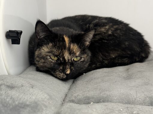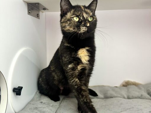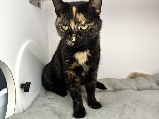 Sansa is a beautiful tortoiseshell kitten with a calm, observant personality. She’s comfortable with people and does well with other cats, happily sharing space without any fuss. We’re not entirely sure how she feels about dogs yet, but she hasn’t shown any signs of aggression toward the ones she’s encountered here at the hospital.